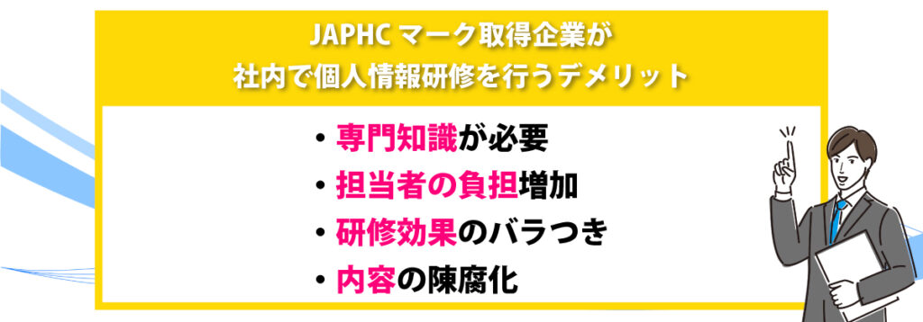 一方、JAPHICマーク取得企業が社内で個人情報研修を完結させることには、以下のようなデメリットもあります。