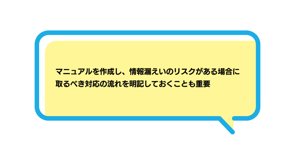 また、マニュアルを作成し、情報漏えいのリスクがある場合に取るべき対応の流れを明記しておくことも重要です。