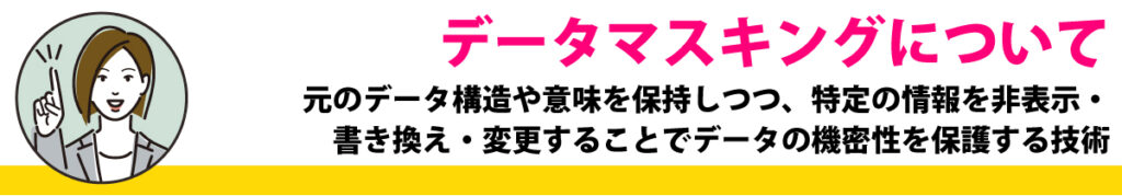 ちなみにマスキングには、個人情報を含むデータを開発やテスト、分析などの目的で安全に活用するという目的でも行われます。